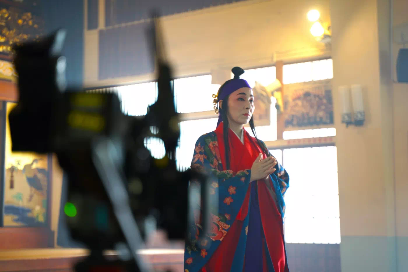 素敵な青い紅型を身にまとい、撮影のスタンバイ