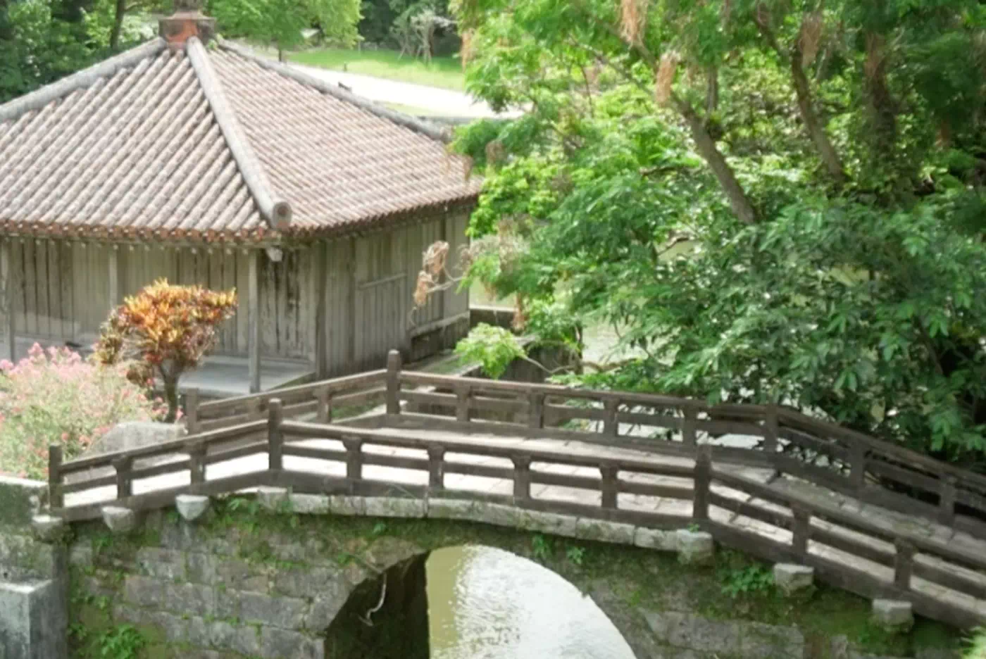 池の中央にある赤瓦の堂を「弁財天堂(べざいてんどう)」